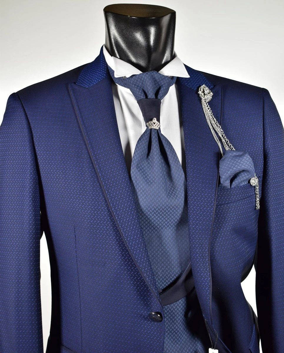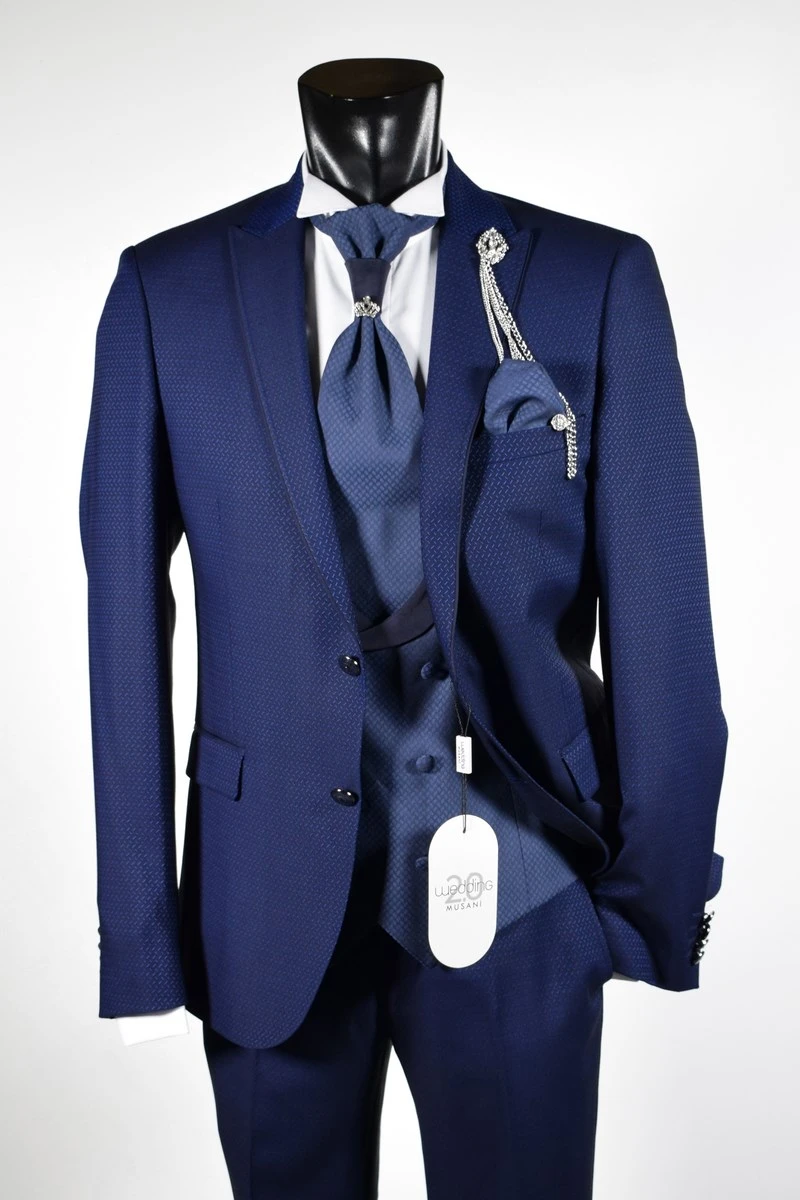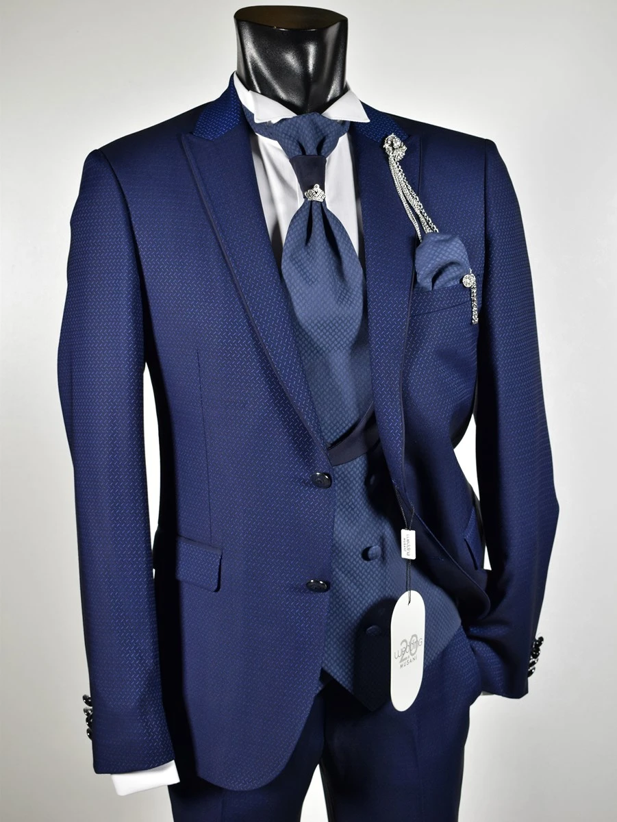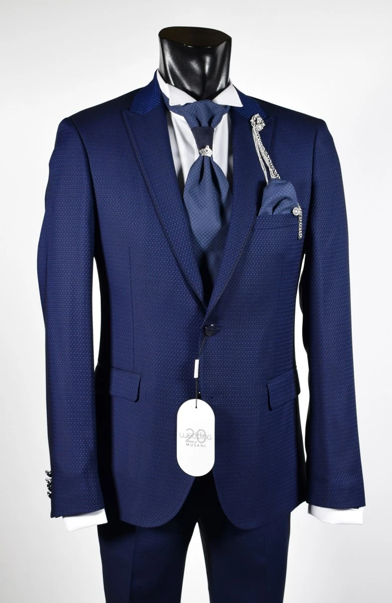 Musani Uomo Abito Blu Damascato Musani Cerimonia Sposo Slim Fit